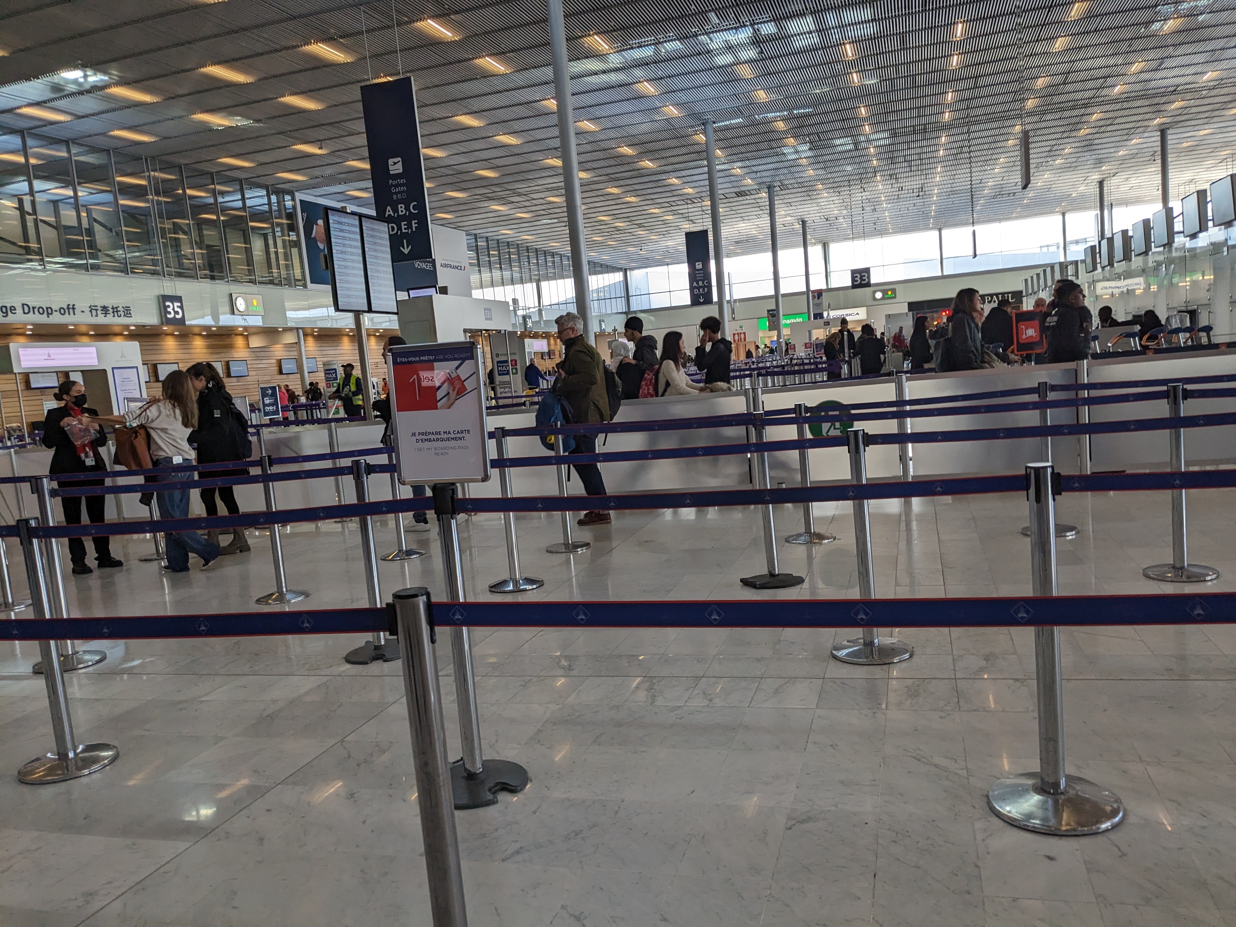 J’emprunte régulièrement le terminal 3 et malheureusement l’expérience est le plus souvent négative. Si ce n’est pas l’afflux mal géré au contrôle sécurité, c’est l’impolitesse des employés ou bien leur comportement qui ne me semble pas bien adapté pour un lieu public. CF la photo, il s’agit de deux employés assises dans les toilettes sur les meubles destinés à se rafraîchir. Ça donne une très mauvaise image.